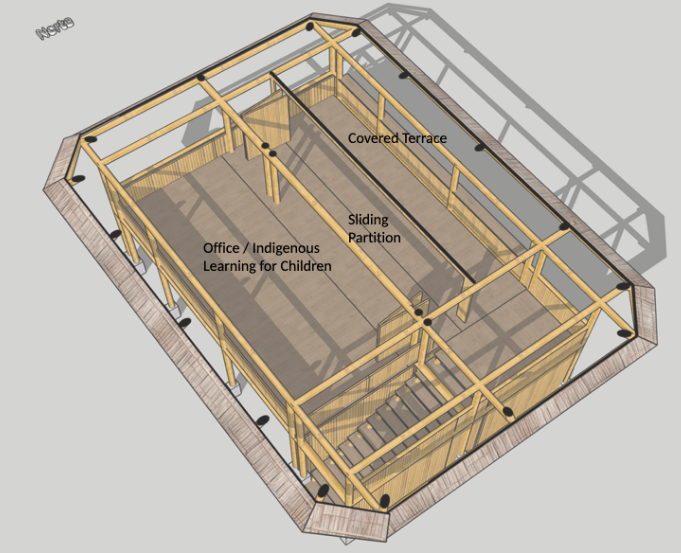 On the upper floor the families themselves can teach their children about indigenous knowledge and topics. Additionally, it will function as an office when needed. This enclosed area has a sliding partition that connects and expands into a covered terrace area, becoming one ample space that still allows the eastern winds to ventilate and cool the building while protecting from the rain.