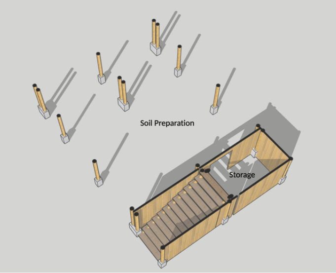 A multi-purpose structure that allows soil preparation for the seedlings and space above for teaching their children and office space.